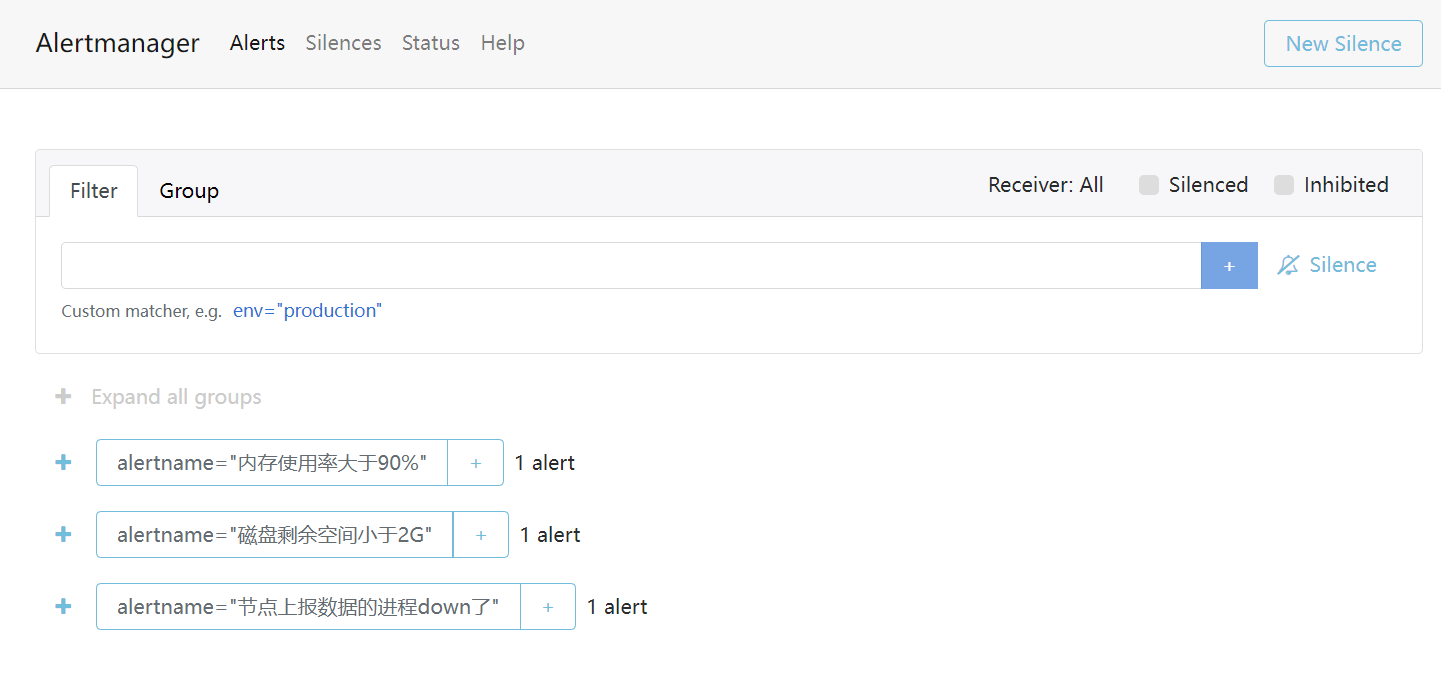 Alertmanager 还提供了一个 web 服务,可在页面中查看到当前所有正在发生的告警,并可对告警进行屏蔽静默操作